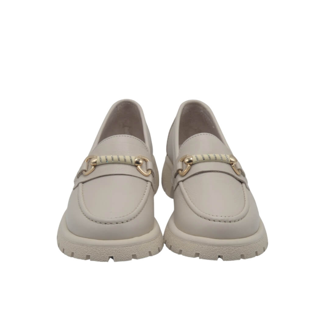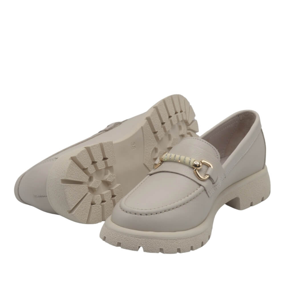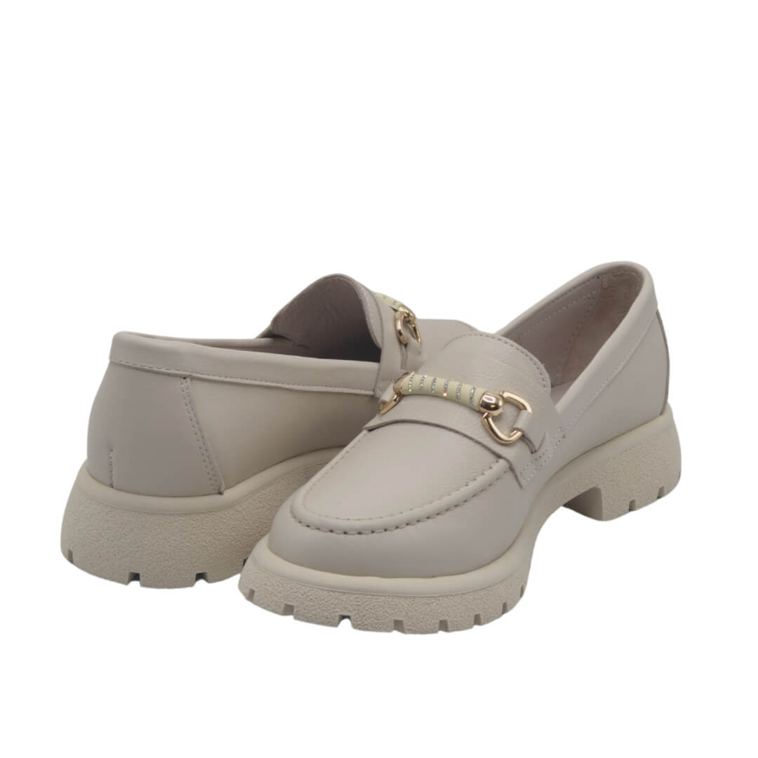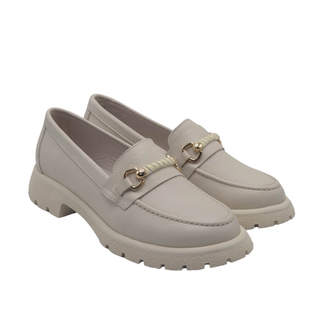 25454259Y kodlu hakiki deri bej loafer, ortopedik taban yapısı ve zarif metal detaylarıyla stilinize sofistike bir dokunuş katıyor.