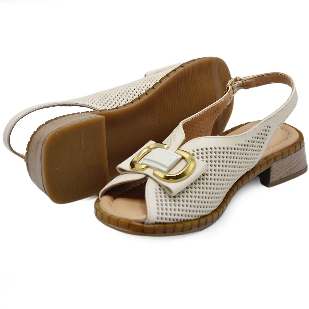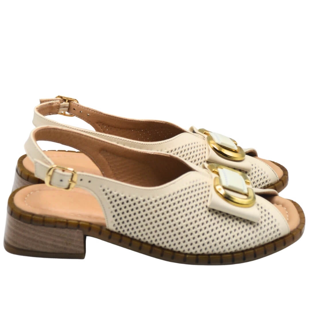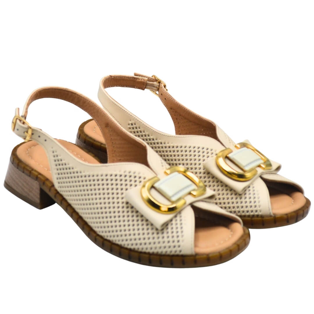 2512003 kodlu bej renk hakiki deri sandalet, gold tokalı kemerli tasarımı ile hem şıklığı hem de konforu bir araya getiriyor.