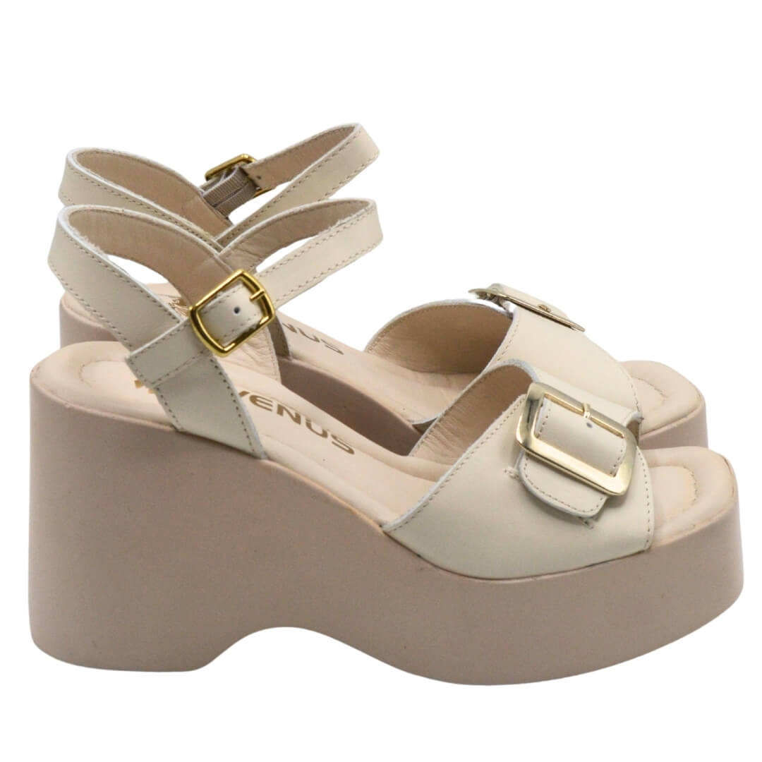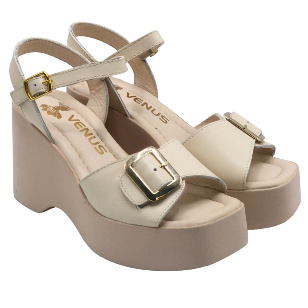 Venüs 2311532 bej dolgu topuk sandalet; sade zarafeti, doğal tonları ve konfor odaklı yapısıyla gün boyu rahatlık sunar.