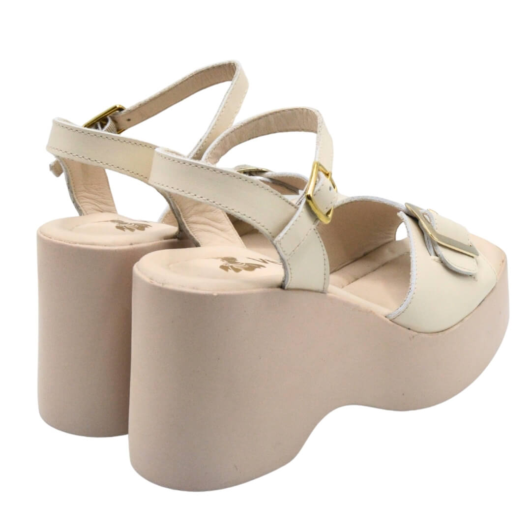 Modern şehir stiline uyum sağlayan bu hakiki deri bej sandalet, dolgu topuk tasarımı sayesinde hem konfor hem de şıklık sunar.