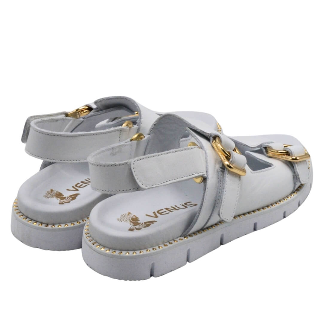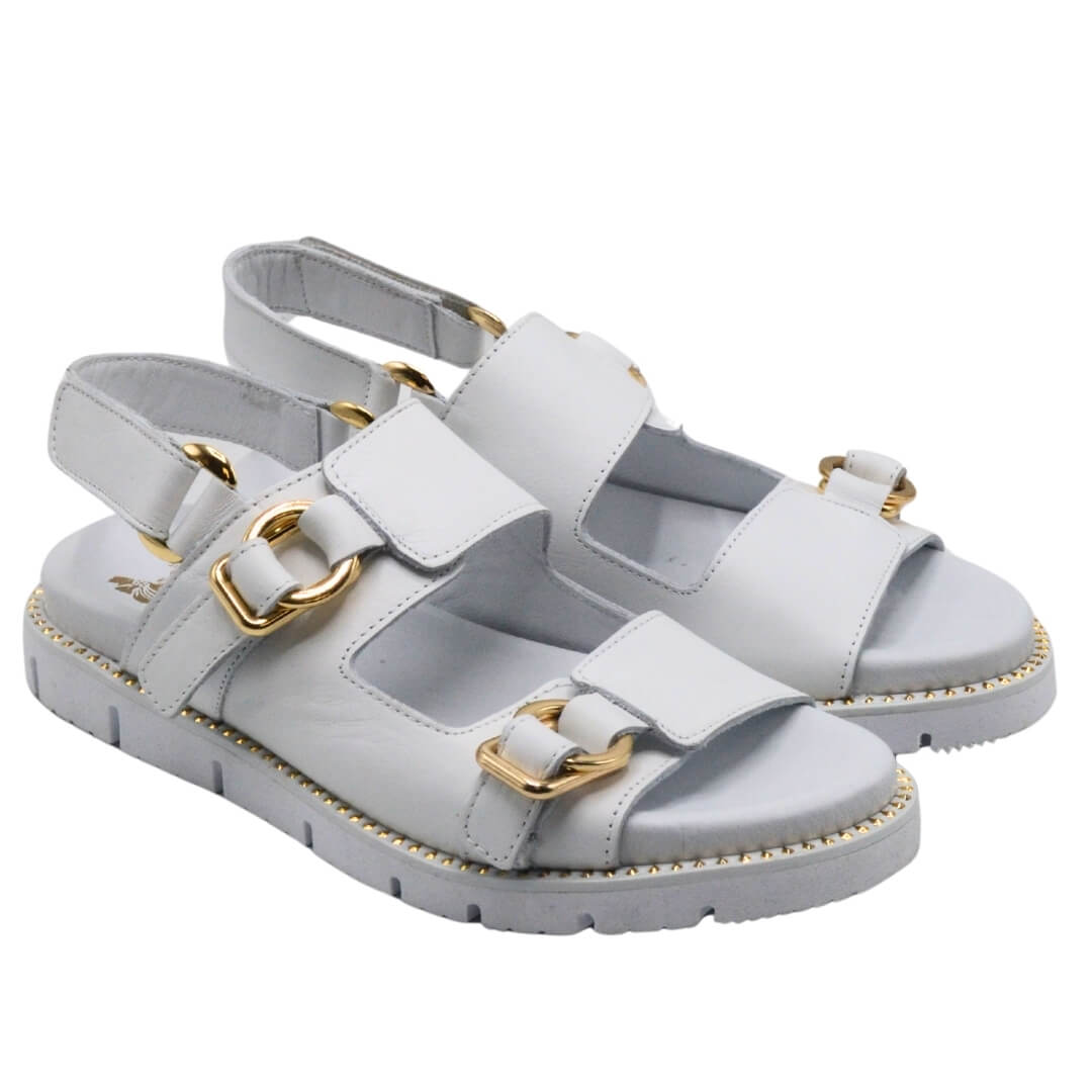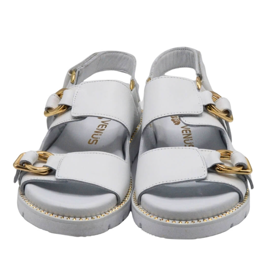 25440013Y kodlu beyaz hakiki deri sandalet, gold tokalı şık tasarımıyla rahatlık ve şıklığı bir araya getiriyor.