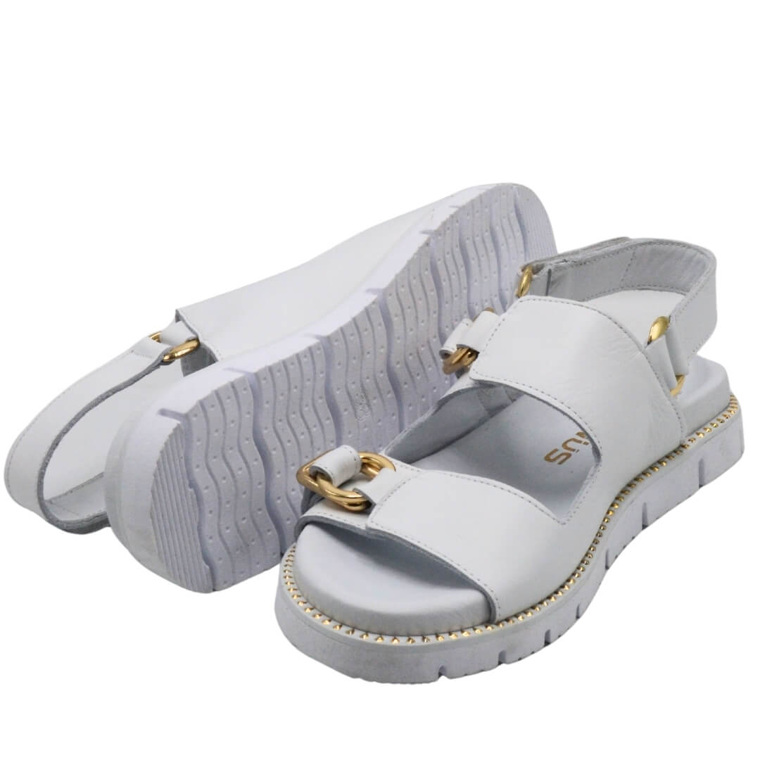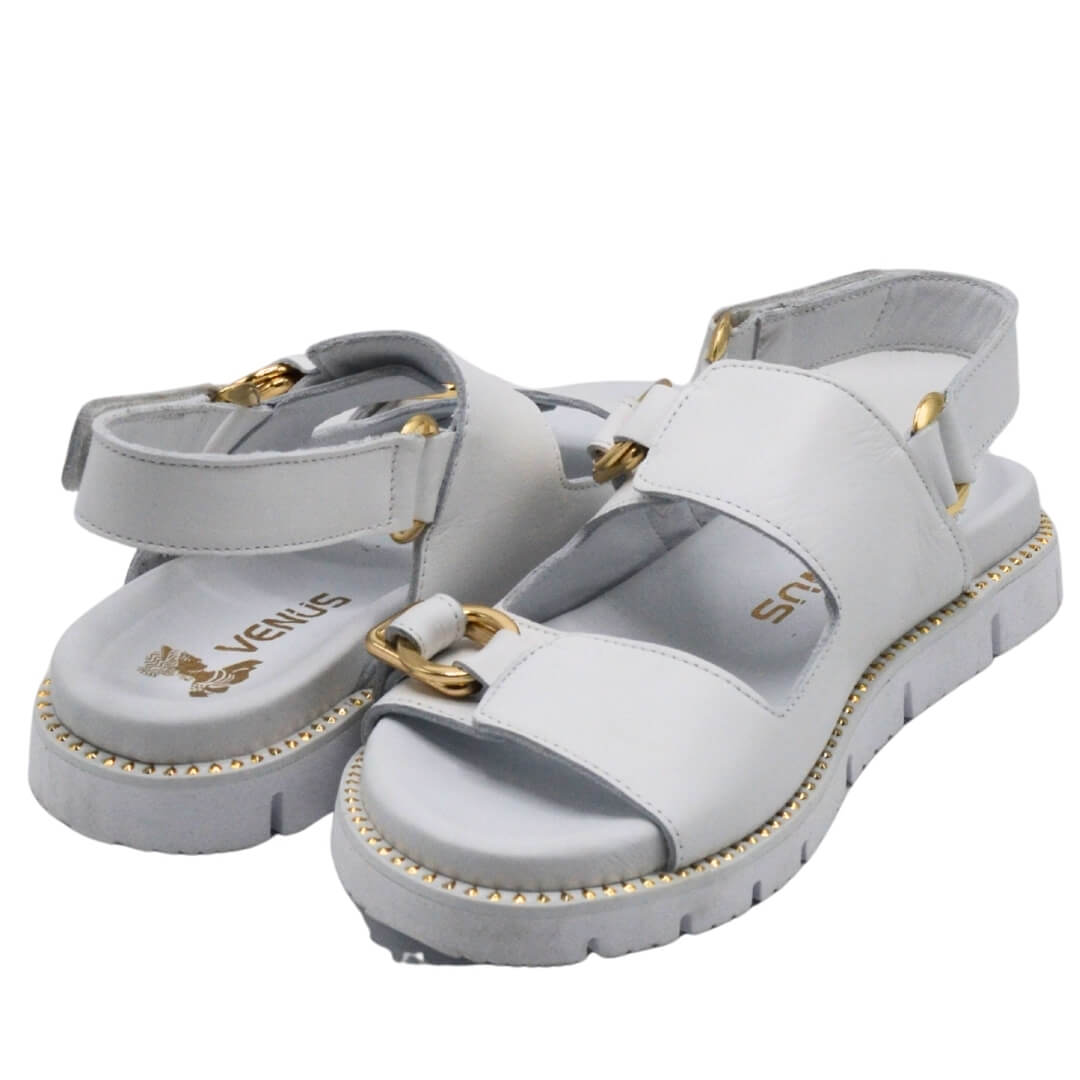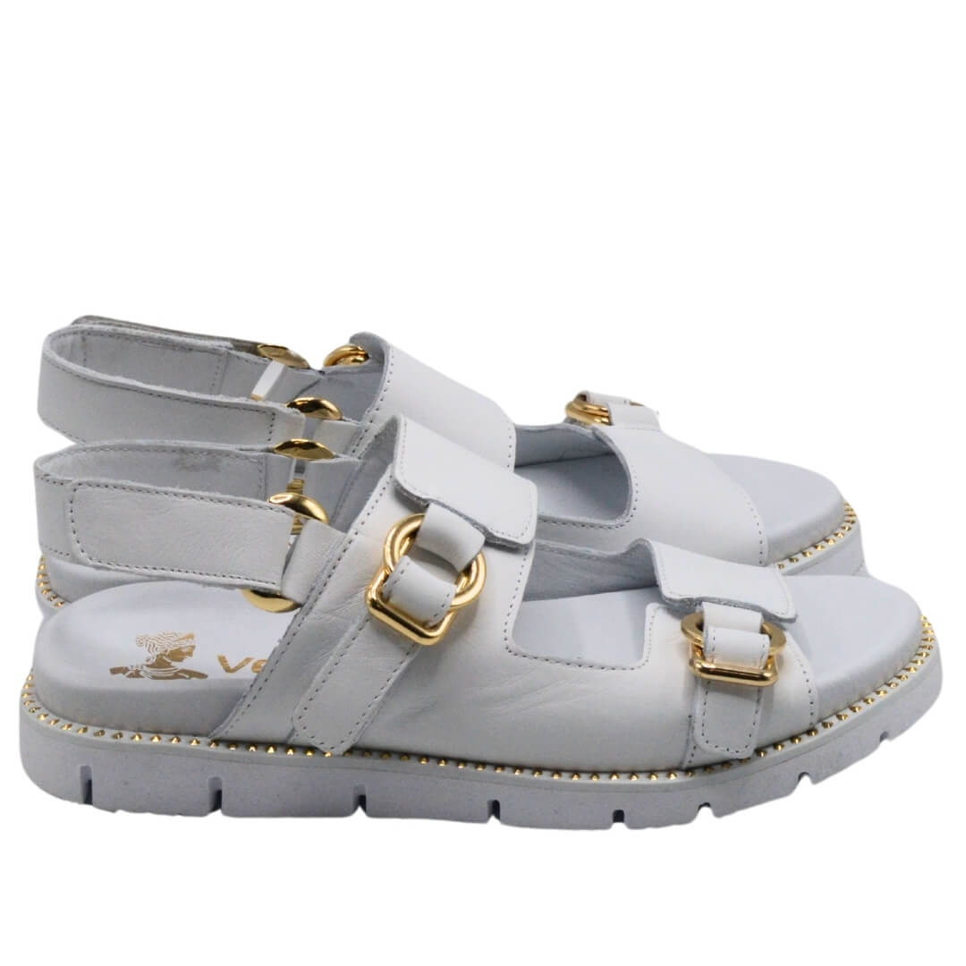 25440013Y kodlu beyaz hakiki deri sandalet, gold tokalı şık tasarımıyla rahatlık ve şıklığı bir araya getiriyor.