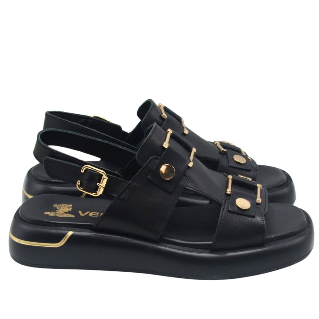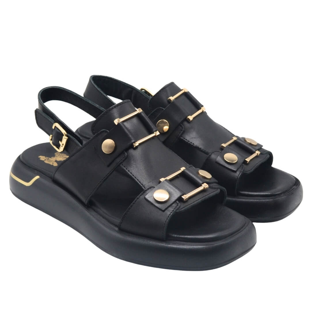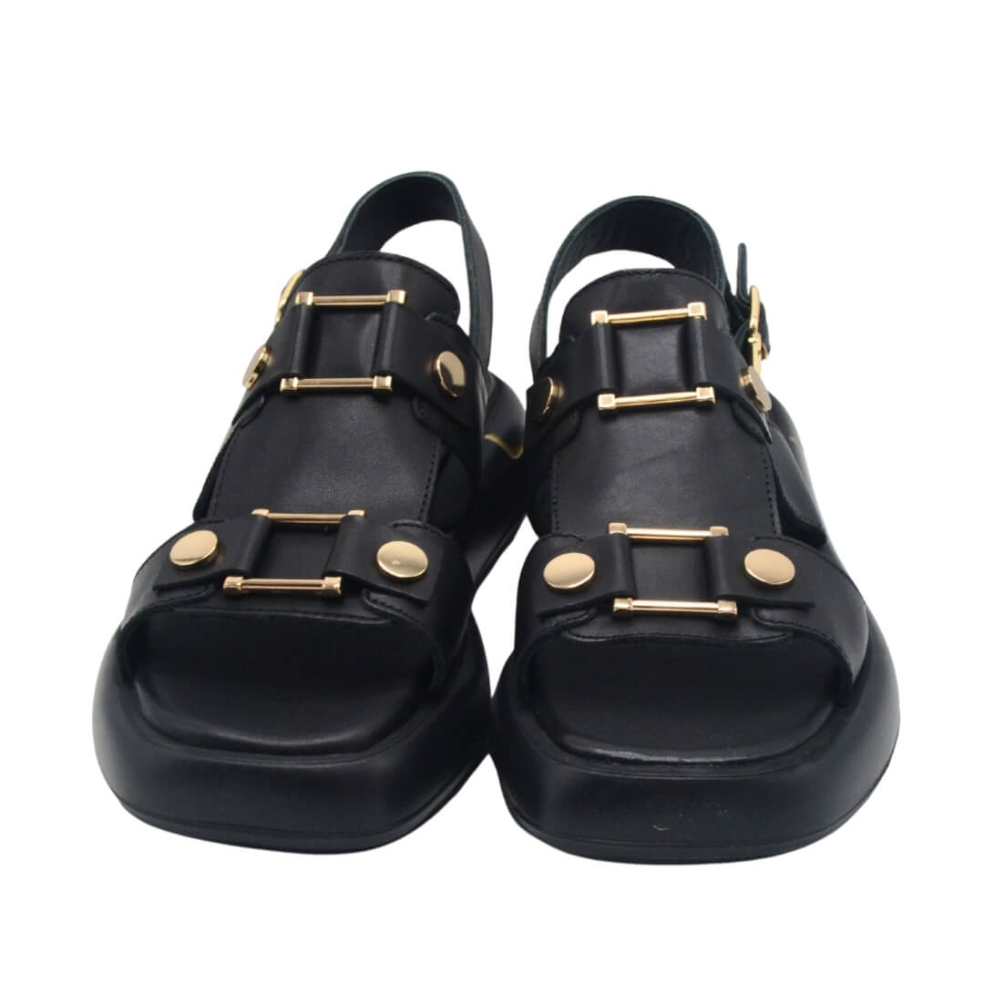 25440007Y kodlu siyah hakiki deri sandalet, gold tokalı şık tasarımıyla rahatlık ve şıklığı bir araya getiriyor.