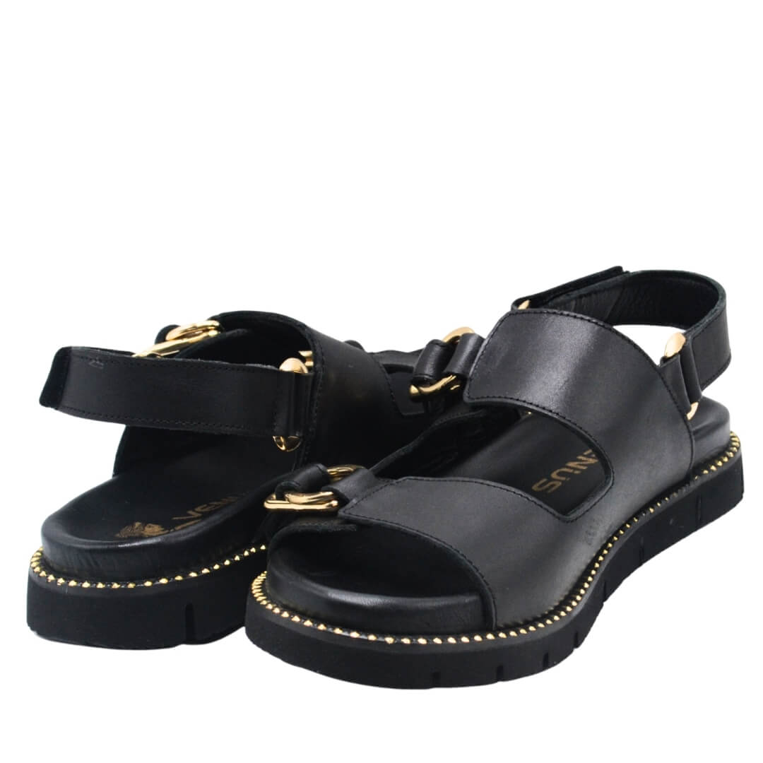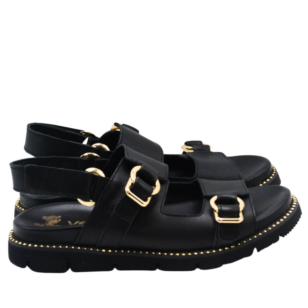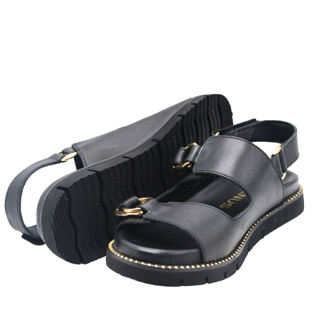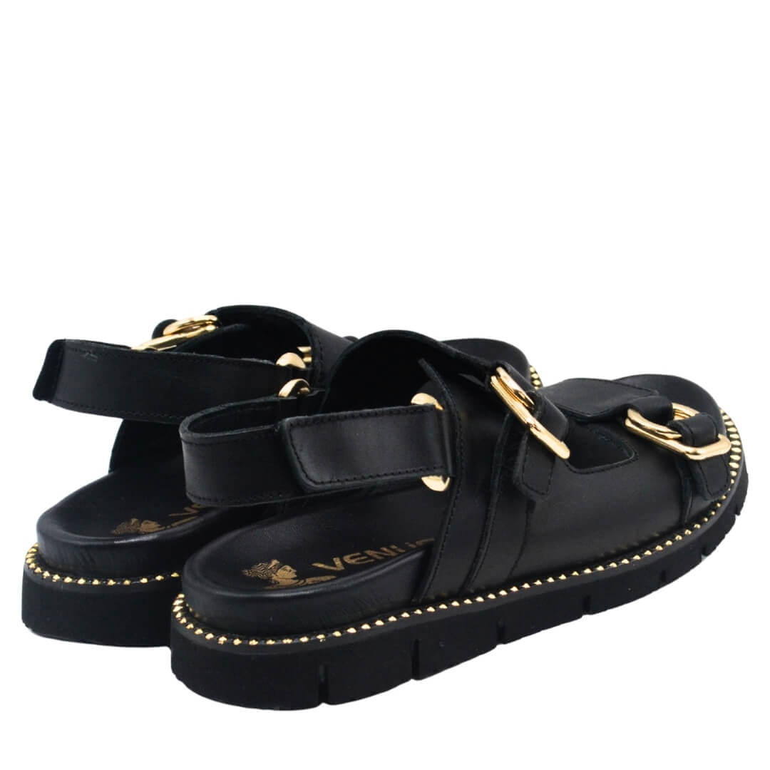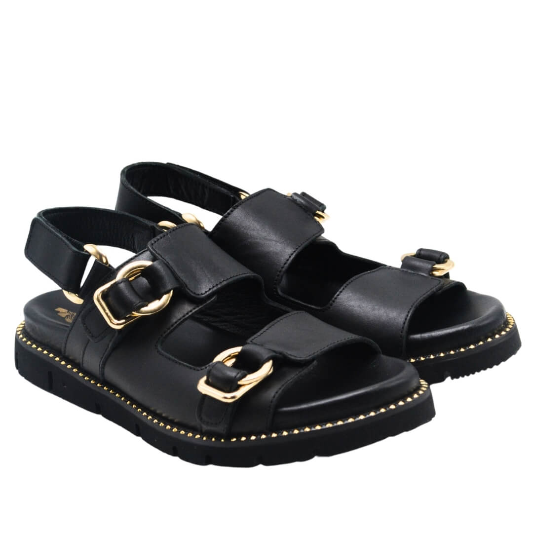 25440013Y kodlu siyah hakiki deri sandalet, gold tokalı şık tasarımıyla rahatlık ve şıklığı bir araya getiriyor.