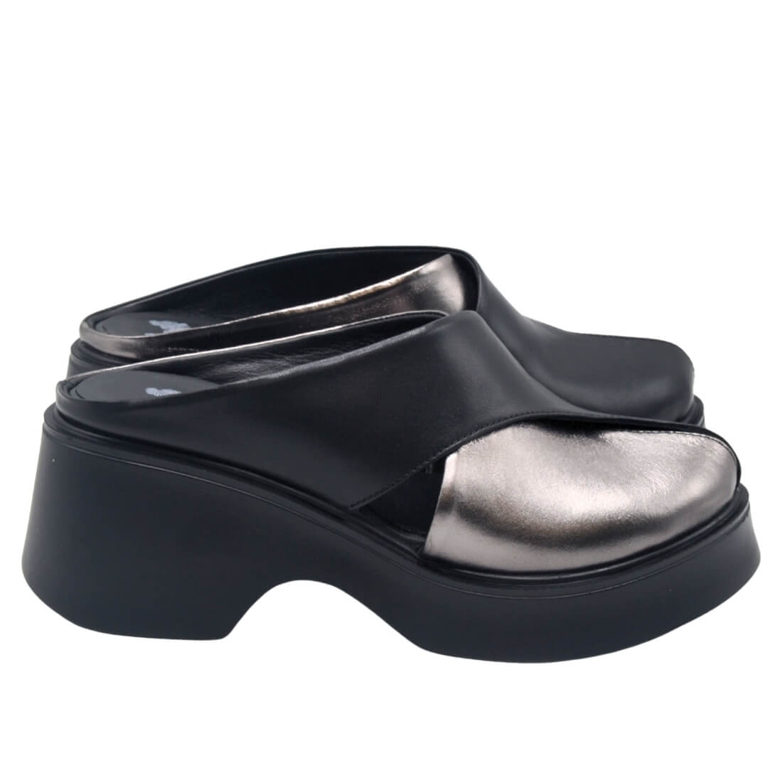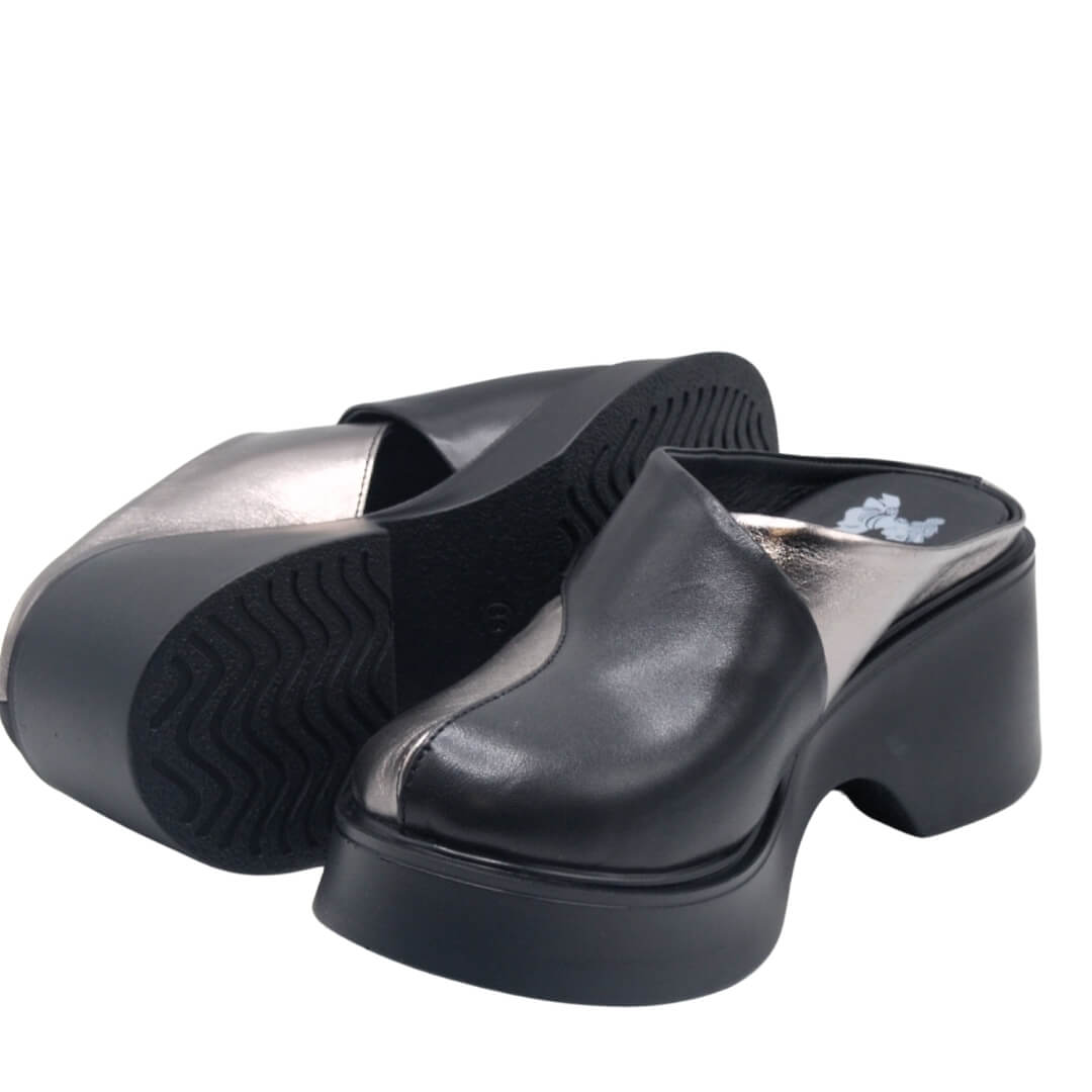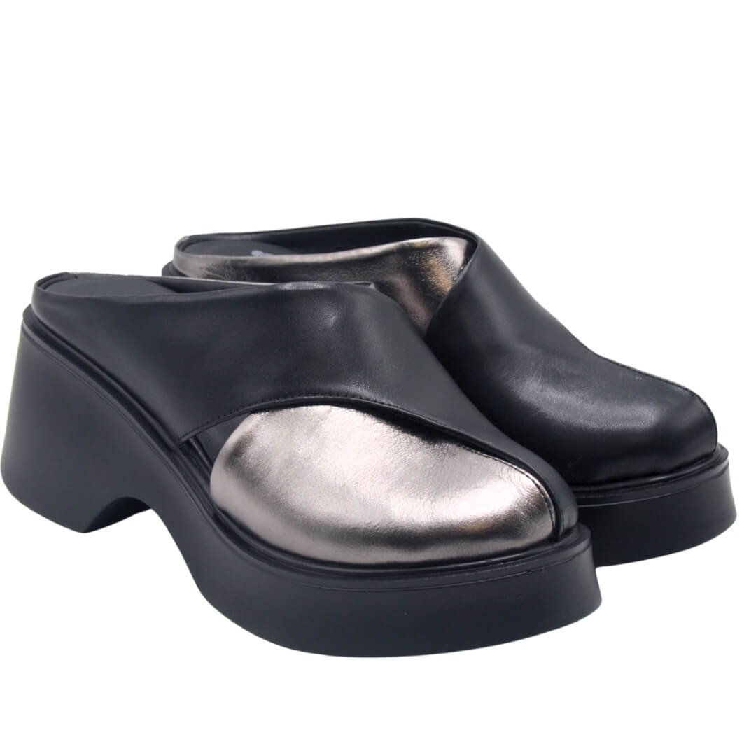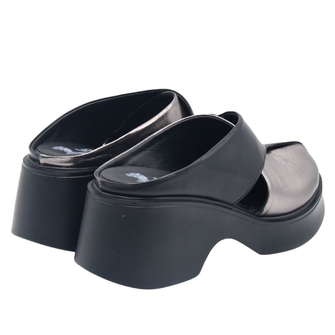 Platin ve siyahın eşsiz uyumuyla tasarlanan platform topuklu terlik, modern şıklığı ve konforu bir araya getiriyor.