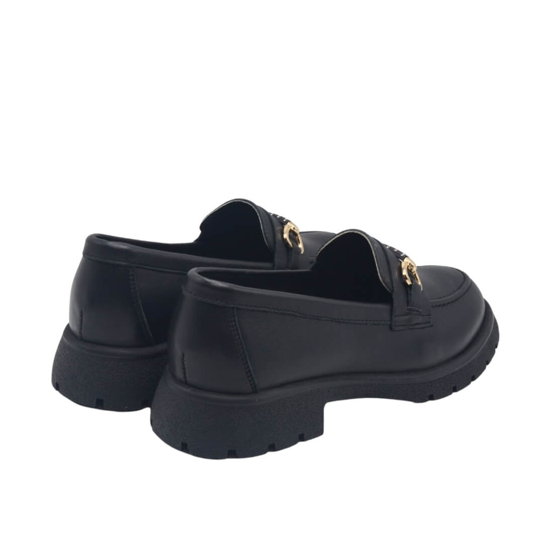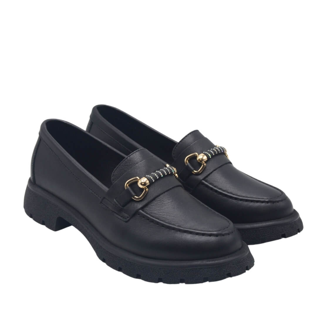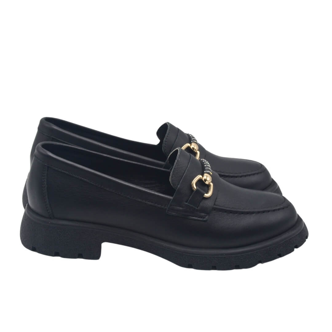 25454259Y kodlu hakiki deri siyah loafer, ortopedik taban yapısı ve zarif metal detaylarıyla stilinize sofistike bir dokunuş katıyor.