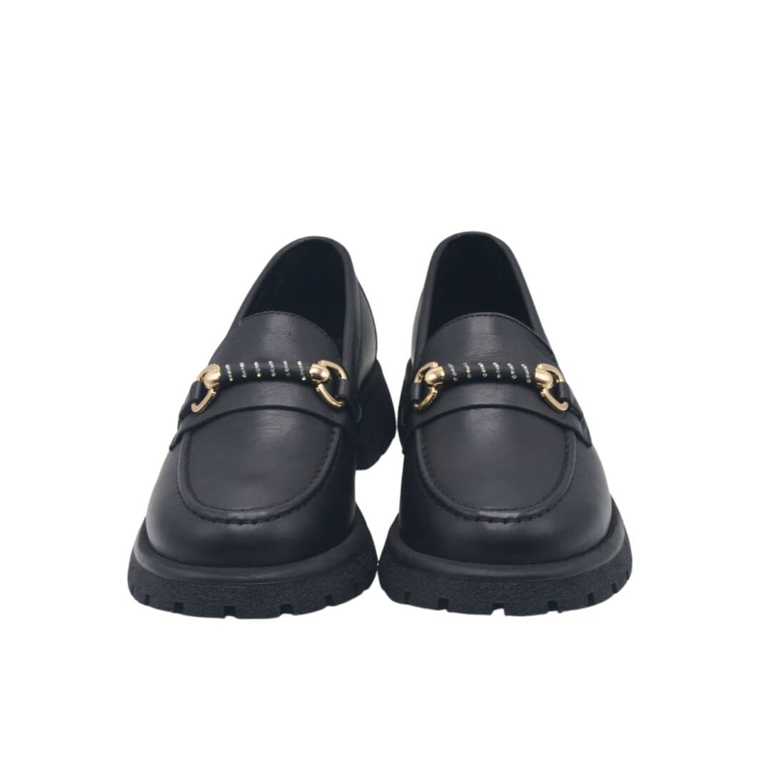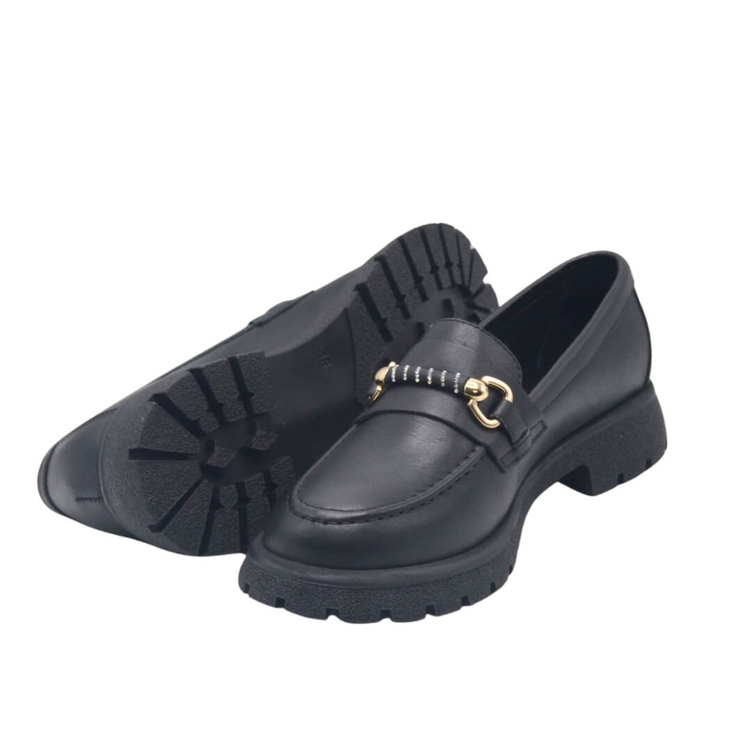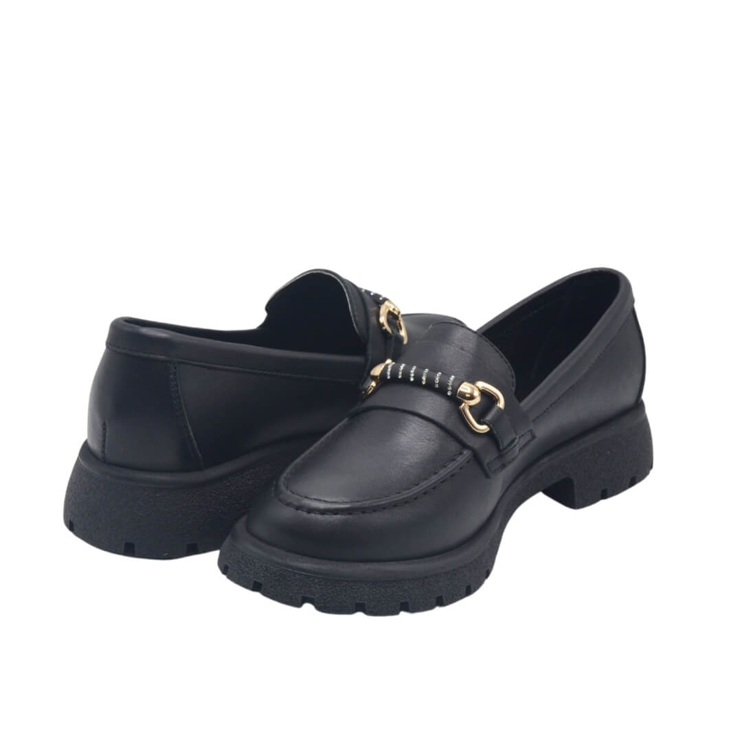25454259Y kodlu hakiki deri siyah loafer, ortopedik taban yapısı ve zarif metal detaylarıyla stilinize sofistike bir dokunuş katıyor.