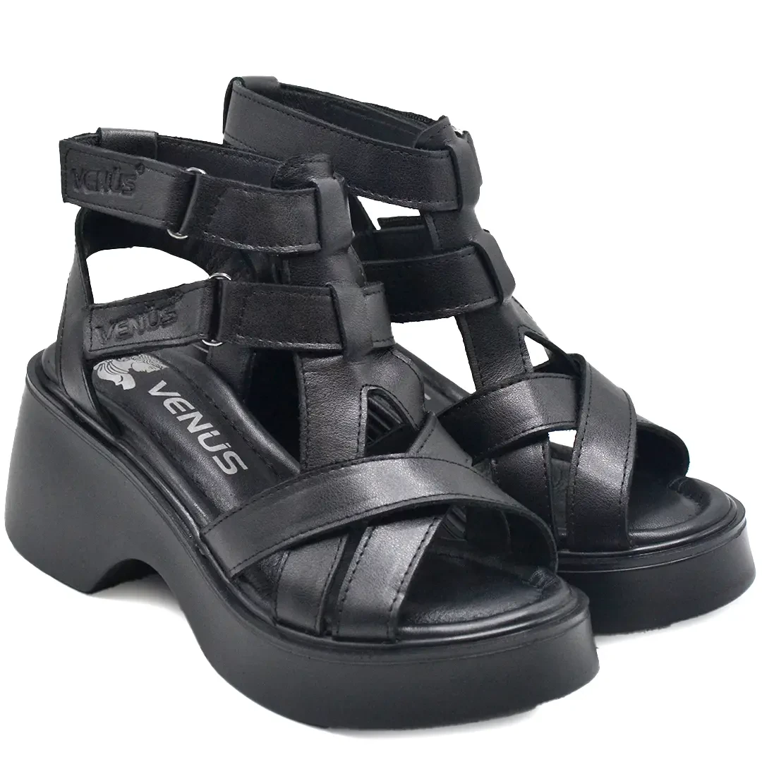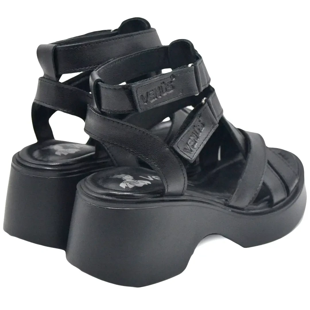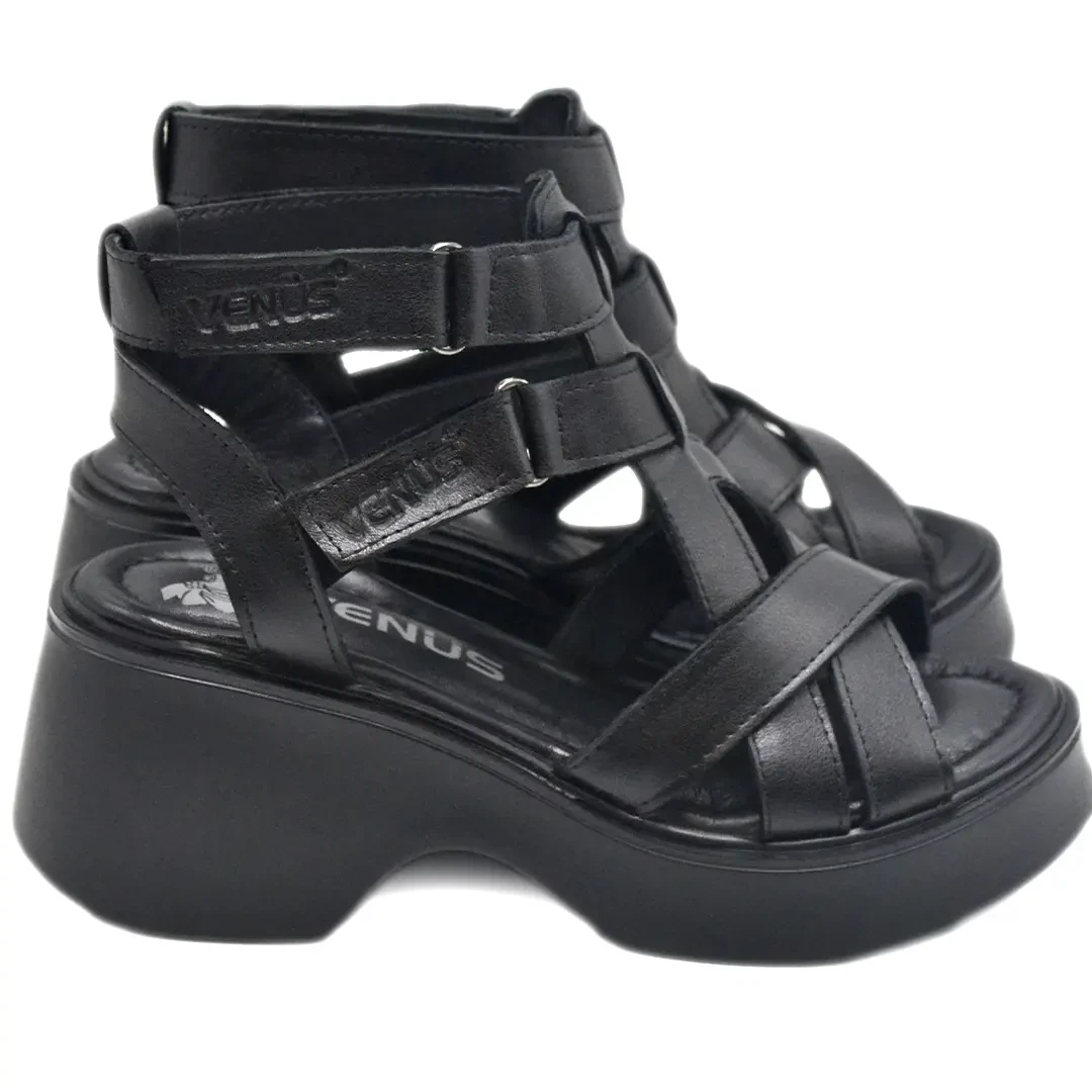 Şıklık ve konforu bir arada sunan Venüs Siyah Deri Platform Sandalet, modern tasarımıyla dikkat çekiyor.