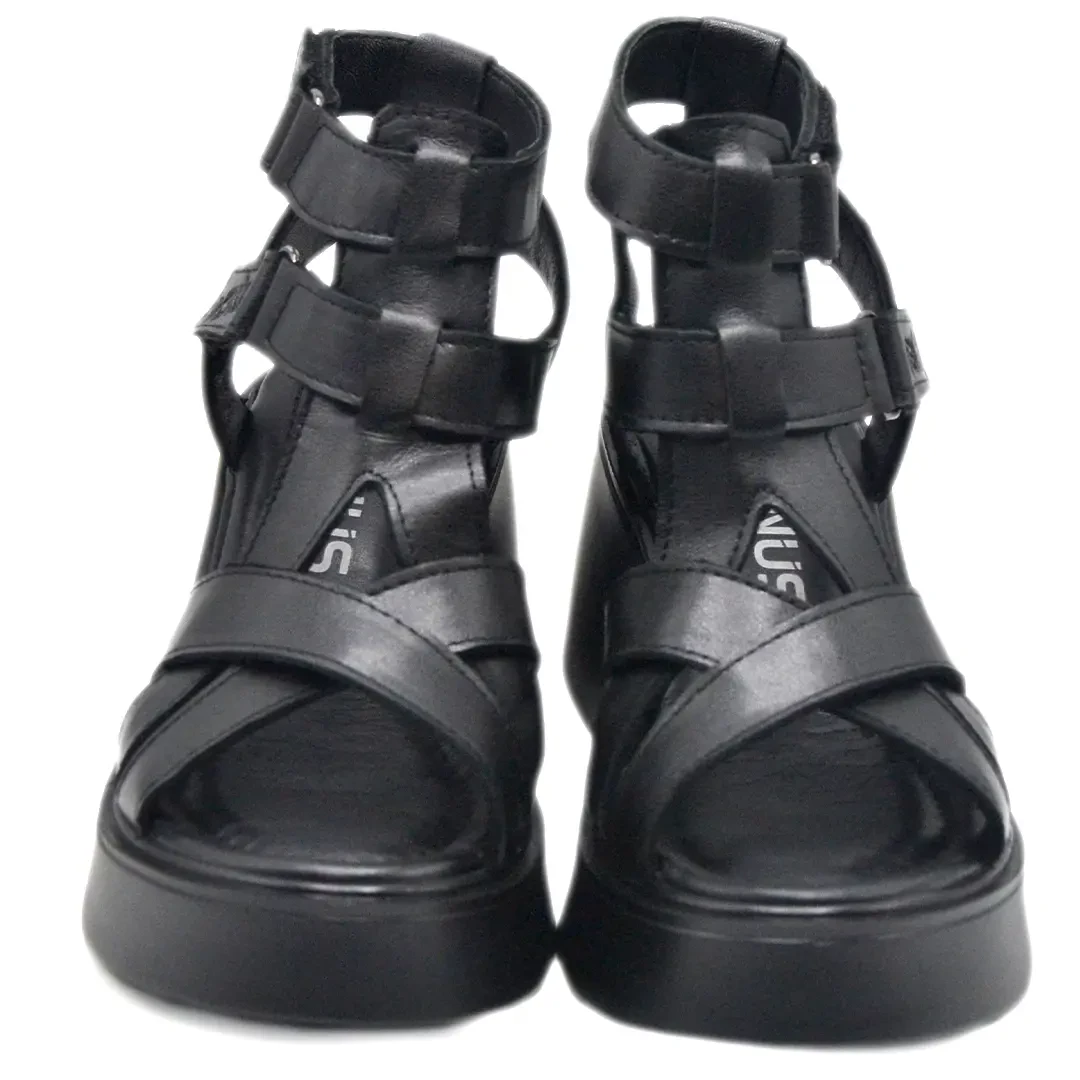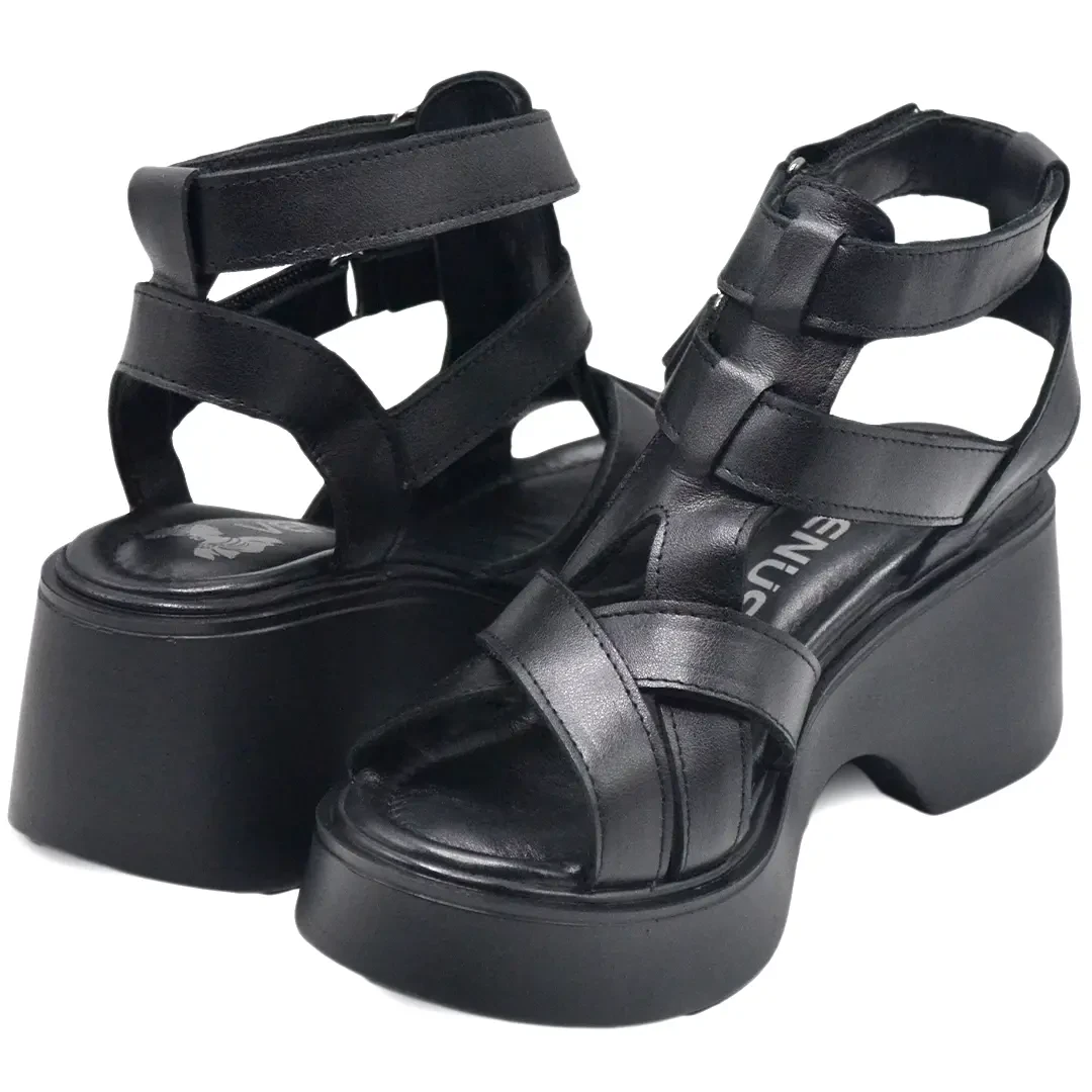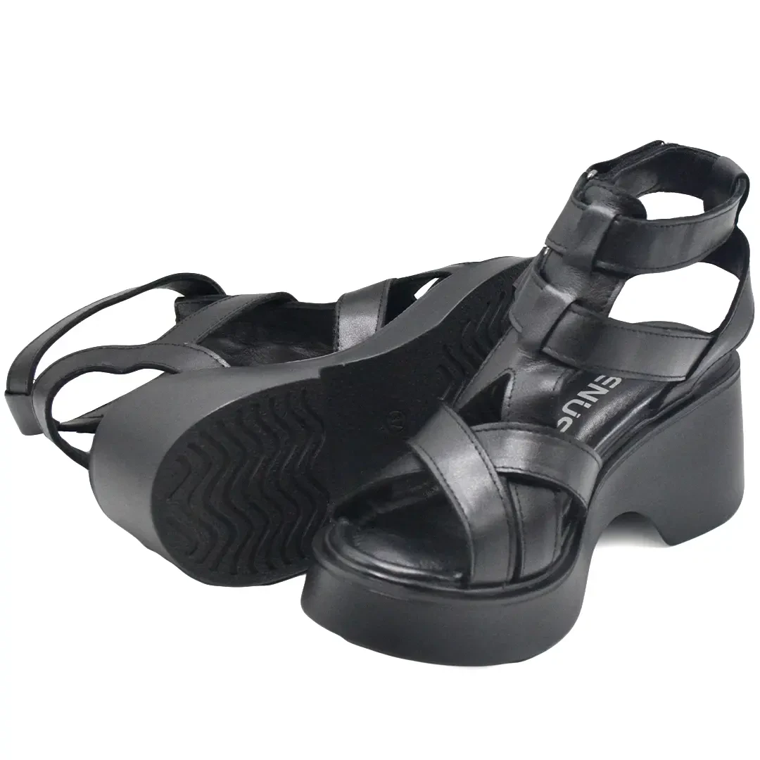 Şıklık ve konforu bir arada sunan Venüs Siyah Deri Platform Sandalet, modern tasarımıyla dikkat çekiyor.