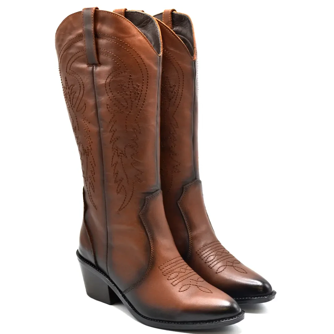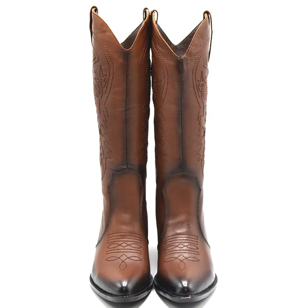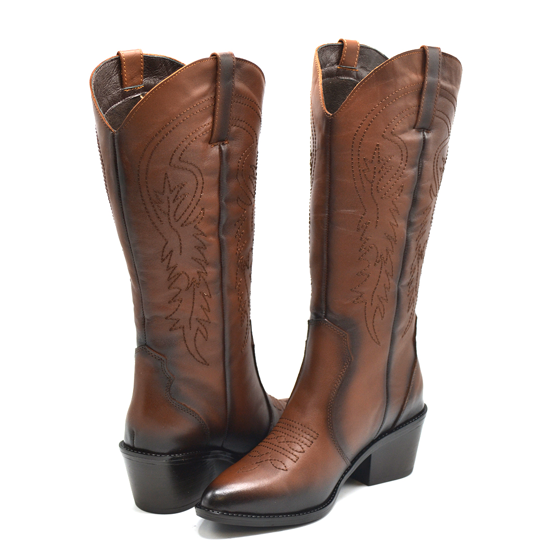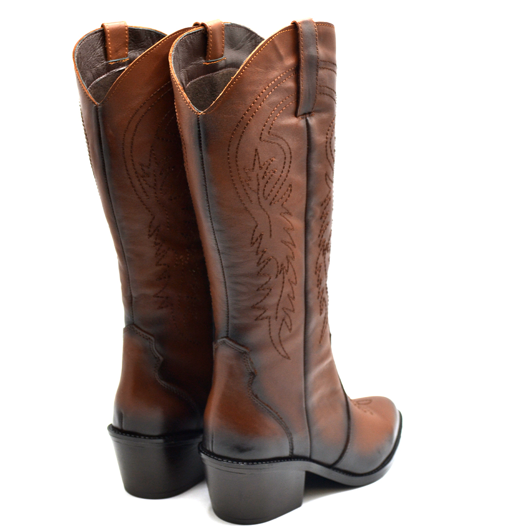 "Cesur ve şık kadınlar için tasarlanan bu kahverengi deri kovboy çizmeleriyle Batı ruhuna adım atın.